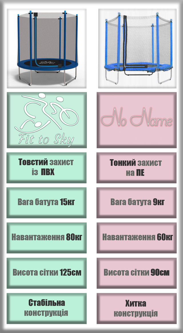 Мы хотели бы представить Вам батут для дома, сада марки FitToSky. Предлагаемый нами батут обеспечивает долгое развлечение как для детей, так и для взрослых. Благодаря специально усиленной конструкции, упрочненным пружинам и сетке наш батут отличается большим запасом прочности по сравнению с продуктами конкурентов. Преимущества данного батута в увеличенной толщине стенок трубок рамы, а также полипропиленового полотна для прыжков. Что позволило увеличить максимально допустимый вес пользователя. Соединения сетки скреплено молнией, а также дополнительно карабином. Батут соответствует европейским стандартам безопасности TUV и CE.