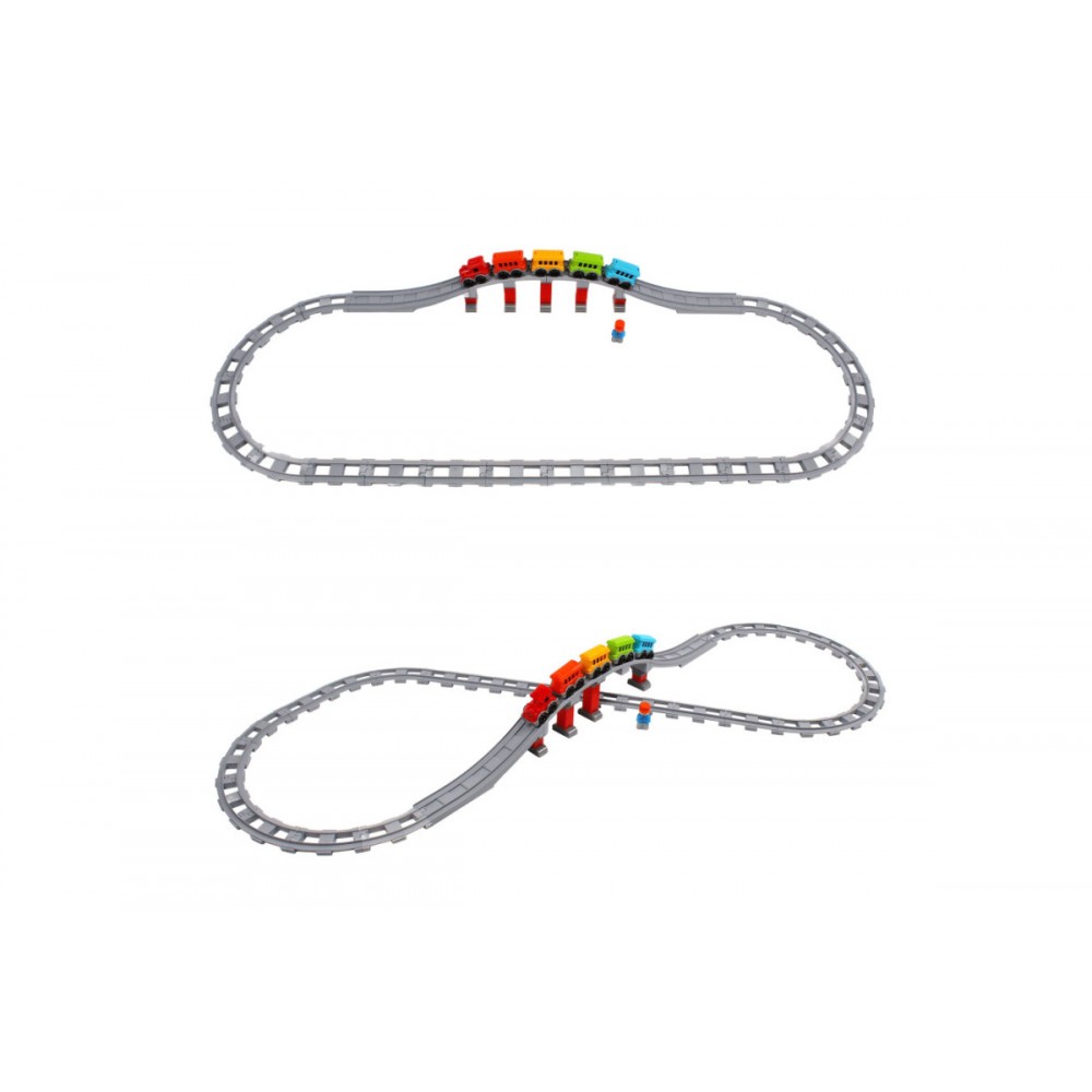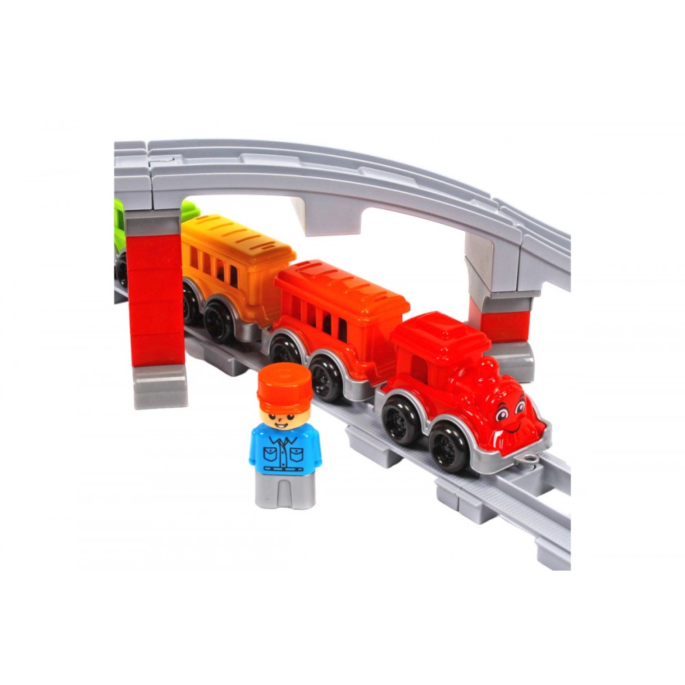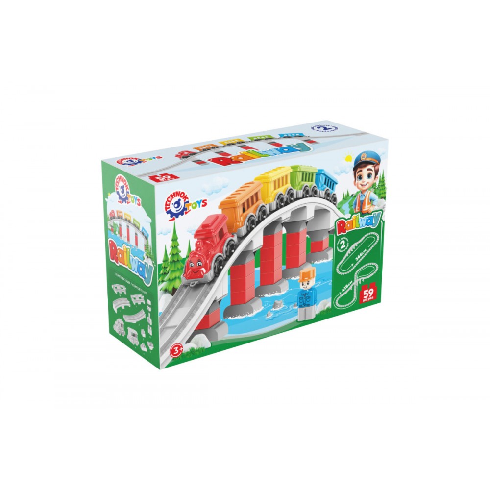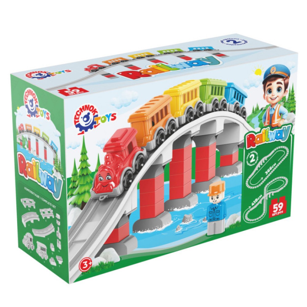 Что внутри набора? 59 крупных и прочных элементов: локомотив и вагоны, мост с опорами, фигурка железнодорожника и разнообразные секции колеи. Благодаря прямым, изогнутым и длинным дугам длина пути достигает примерно 3,86 м, а при альтернативной раскладке — до 4,38 м. Детали приятно держать в руках, они легко соединяются и так же просто разбираются. Набор совместим с другими конструкторами TechnoK и серией «Мини транспорт» — можно поступово расширять мир ребёнка.