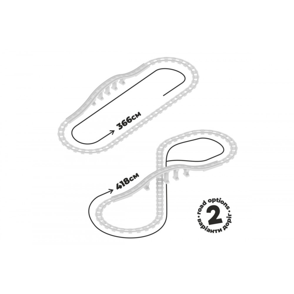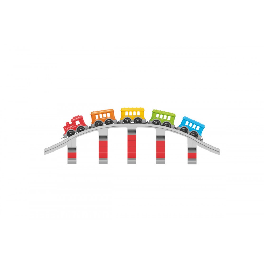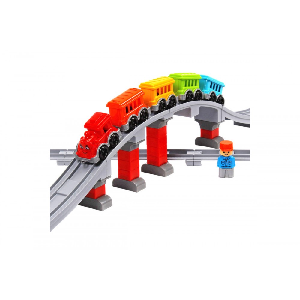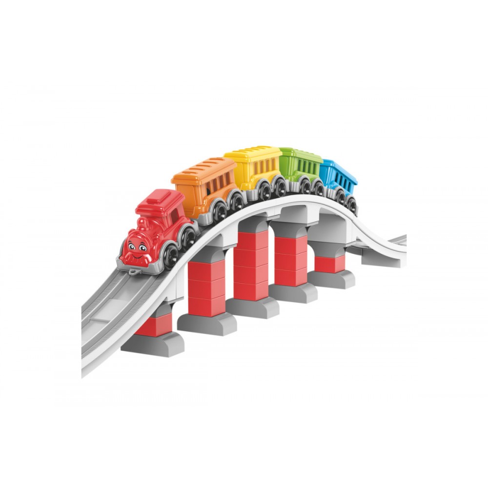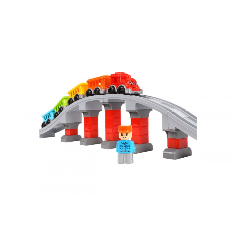 - Комплектация – 59 деталей: локомотив, 4 вагона, мост с опорами, фигурка железнодорожника, элементы колеи (16 прямых, 8 изогнутых, 2 длинные дуги)