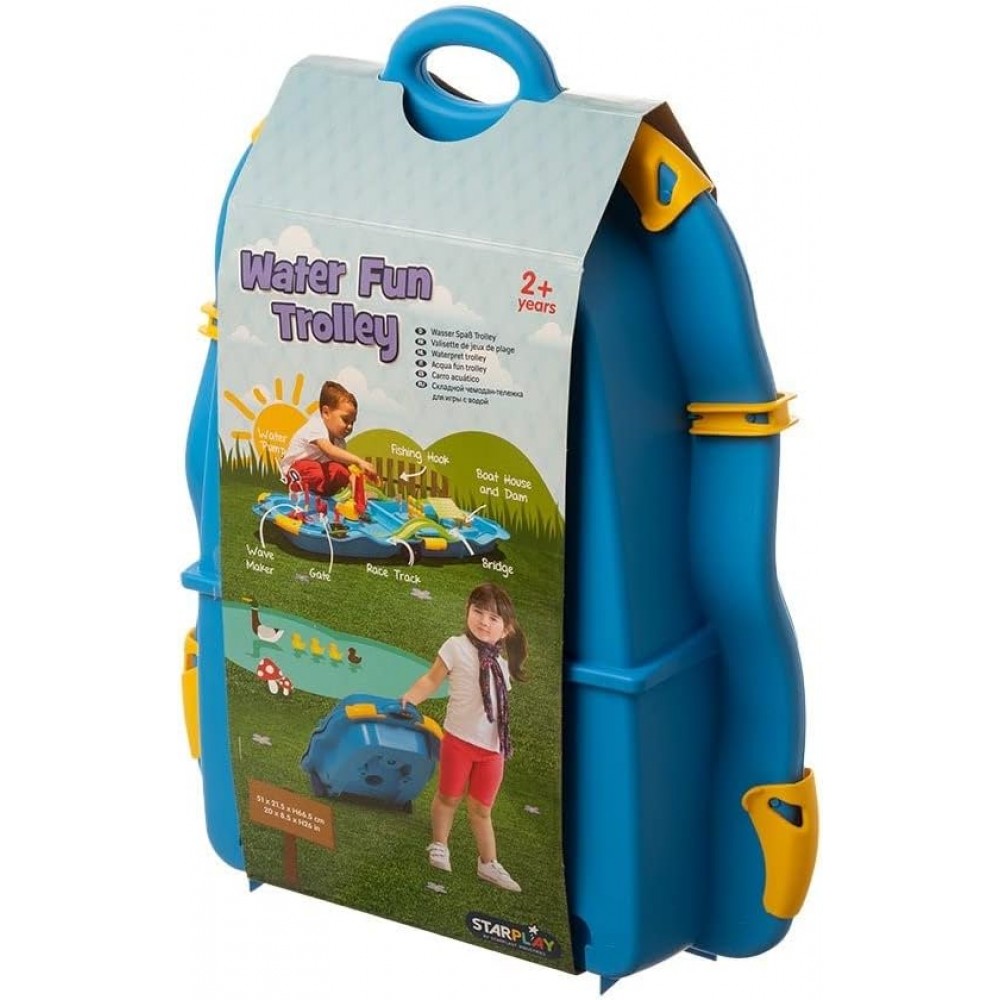 С виду — лёгкий чемодан с ручкой и колёсиками, а внутри — настоящий аквапарк! Starplay Water Fun Trolley превращает любое место в увлекательный водный мир. Просто разложите створки, налейте воду — и две ёмкости (вместимость до 10 литров) превращаются в систему каналов со шлюзами, дамбами, краном, волновой машиной и трассой для водных гонок. Всё необходимое уже в комплекте!